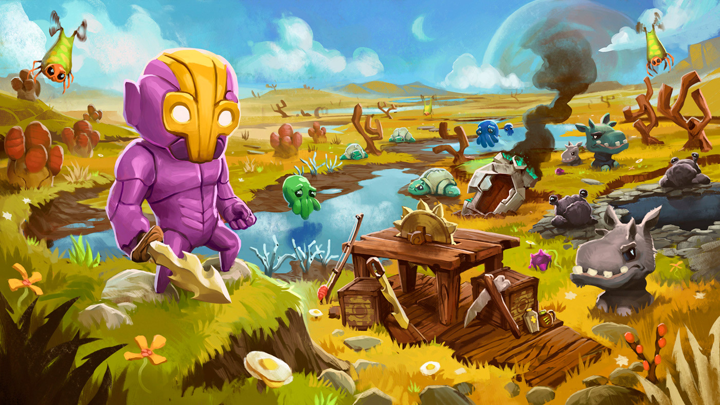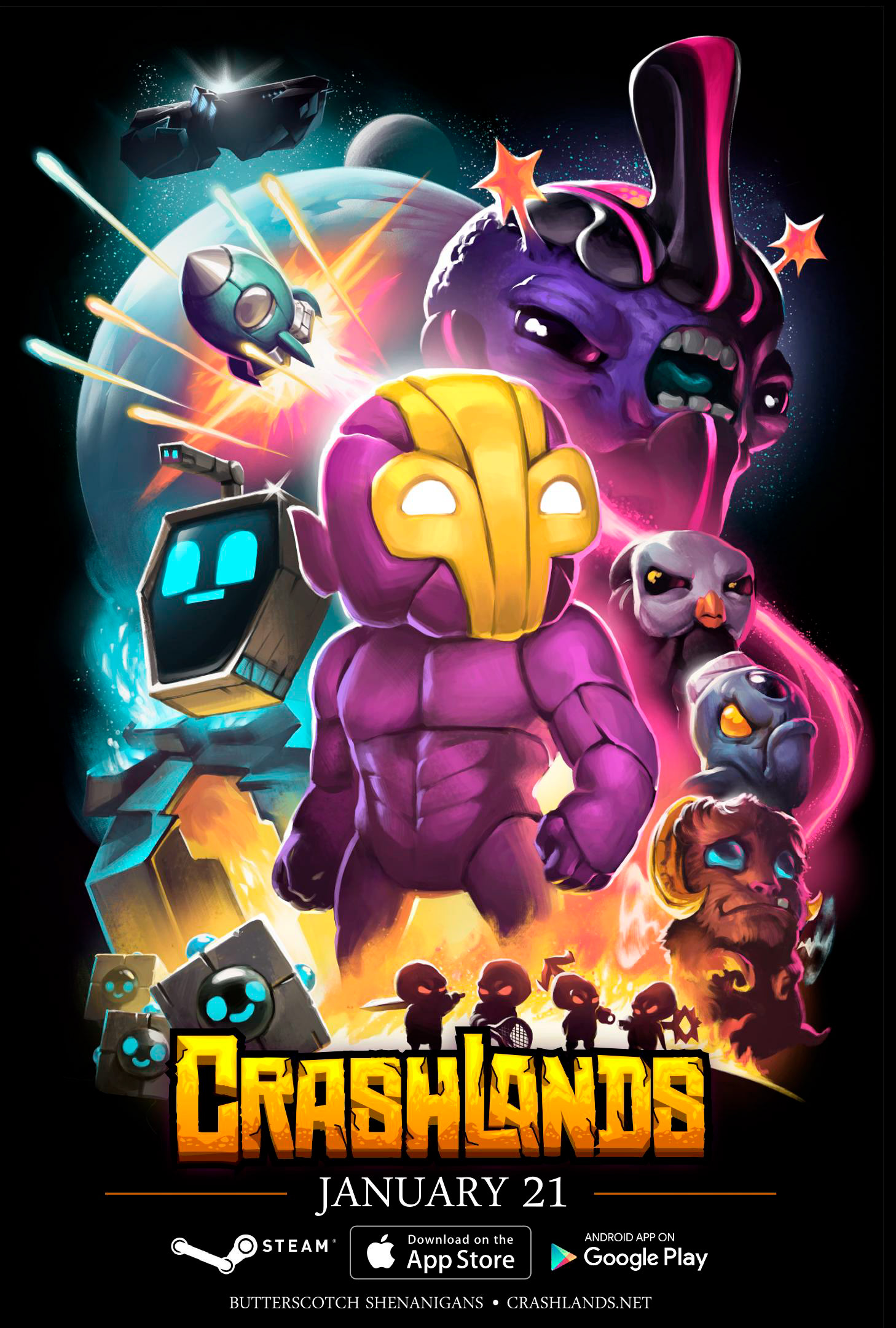 Promotional illustrations and poster art for the Butterscotch Shenanigans game Crashlands. https://www.crashlands.net/