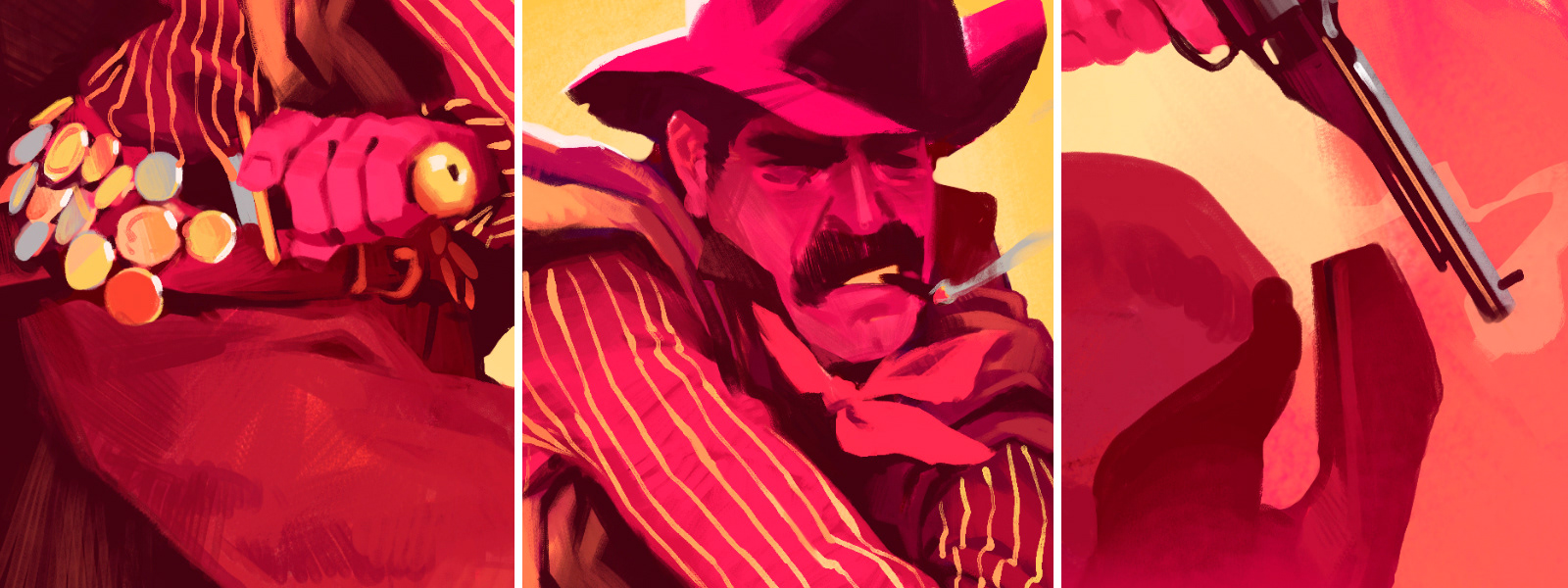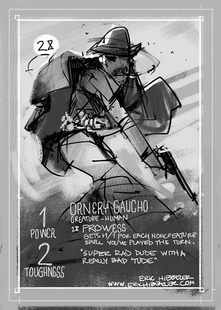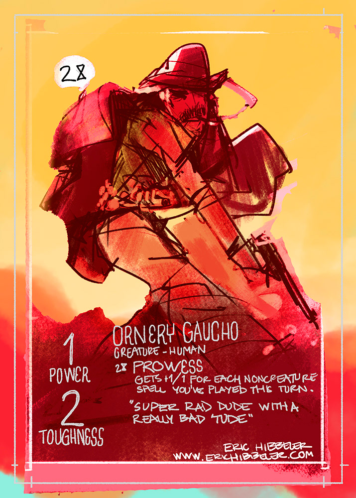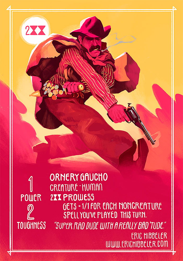 Card illustration for the Tapped Deck project. Card titled "Ornery Gaucho"