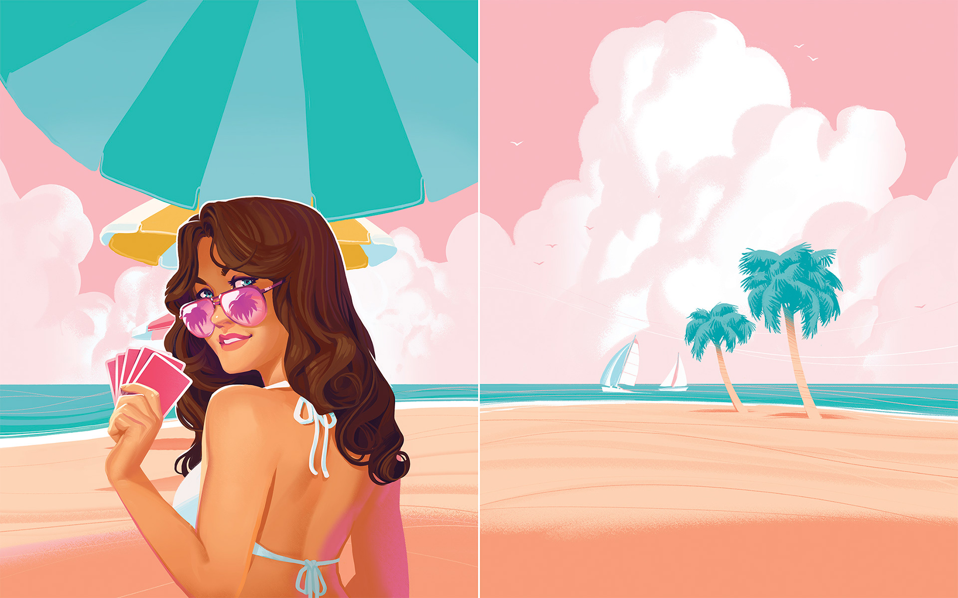 Twin Palms is a beach-themed card game, embracing a vision of a 1980's tropical paradise. I was tasked with illustrating the wraparound box cover, complete card deck as well a playmat and tokens, all in a sunny color palette. From watermelon to Walkmans, surfboards to suntan lotion, the illustrations created for this game indulge in the romance of a holiday filled with sand and sea.